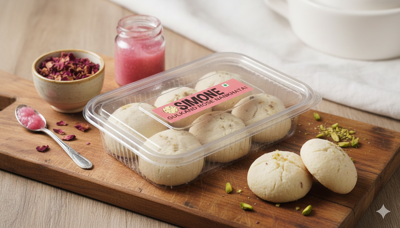 INGREDIENTS ; Maida, rava, baking soda, baking powder, sugar, gulkand, rose essence, cardamom powder, badam & pistachios slice