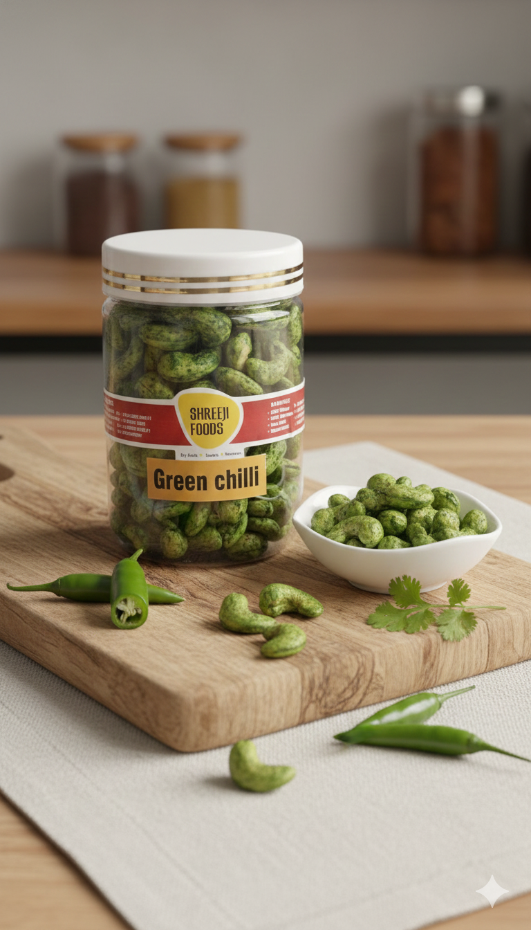 Try green chilly cashew made from premium roasted cashews coated with zesty green chili spices. Spicy, crunchy snack perfect for parties and gifting.