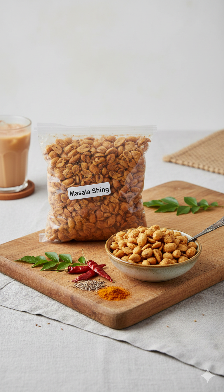 Masala Shing is a crunchy and flavorful snack made from premium peanuts coated with bold Indian masala spices. Perfectly roasted for extra crunch, it delivers the right balance of spice and taste in every bite. Ideal for tea-time, parties, or anytime snacking, Masala Shing is a must-have for spice lovers.