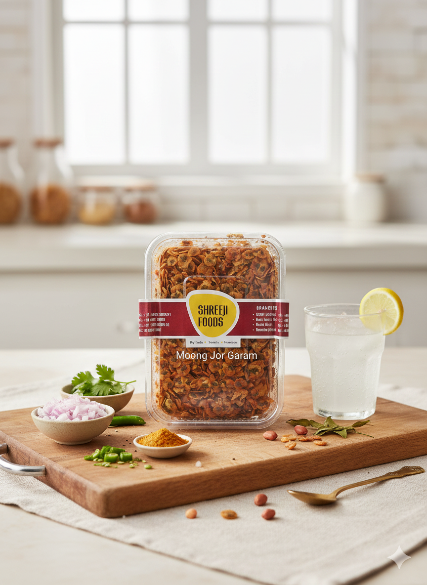 Moong Jor Garam is a crunchy, flavorful snack made from premium moong dal (green gram) roasted with traditional Indian spices. High in protein and packed with bold taste, this snack is perfect for tea-time, parties, or healthy munching anytime. Enjoy the perfect balance of crispiness and spice in every bite.