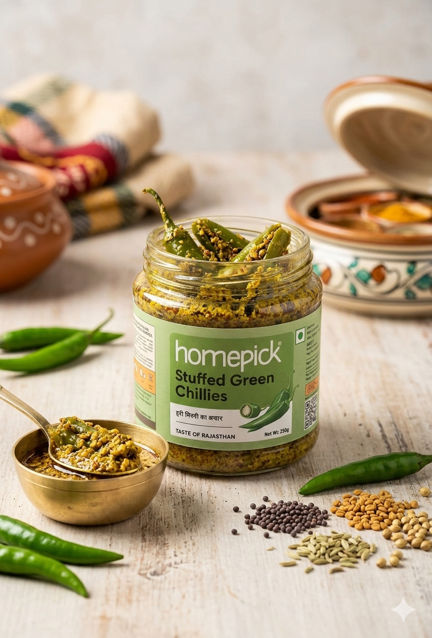 Enjoy the bold taste of Homepick Stuffed Green Chillies Pickle, made with fresh green chillies and traditional spices. A spicy, tangy bharwa mirch achar for every meal.